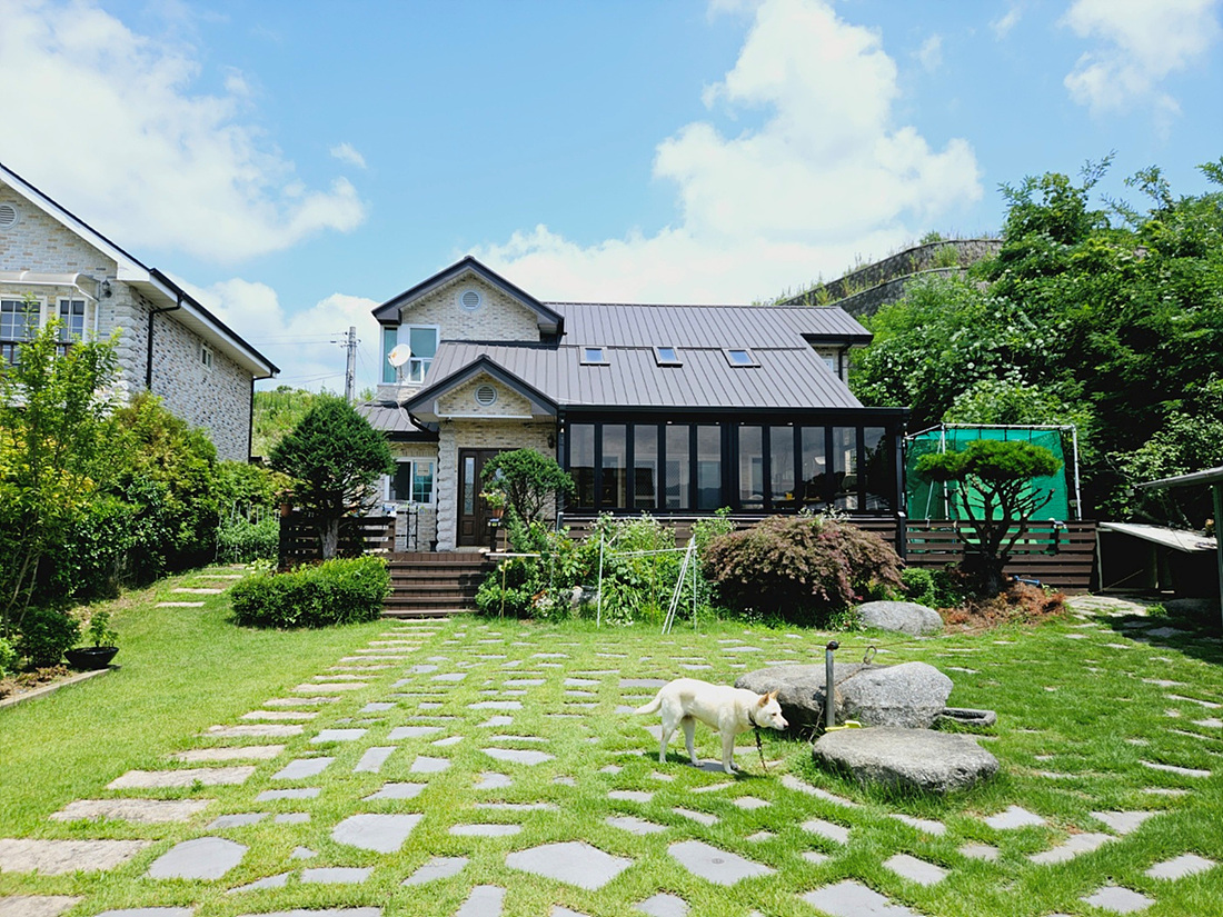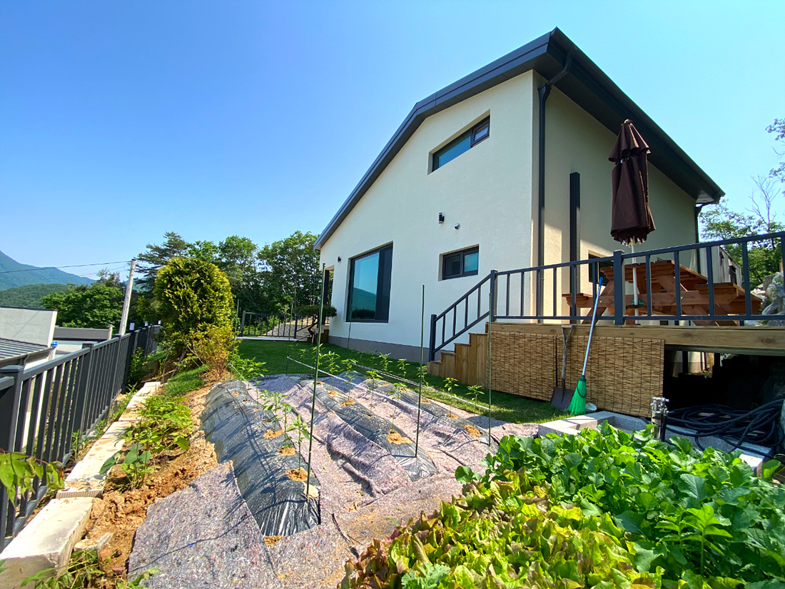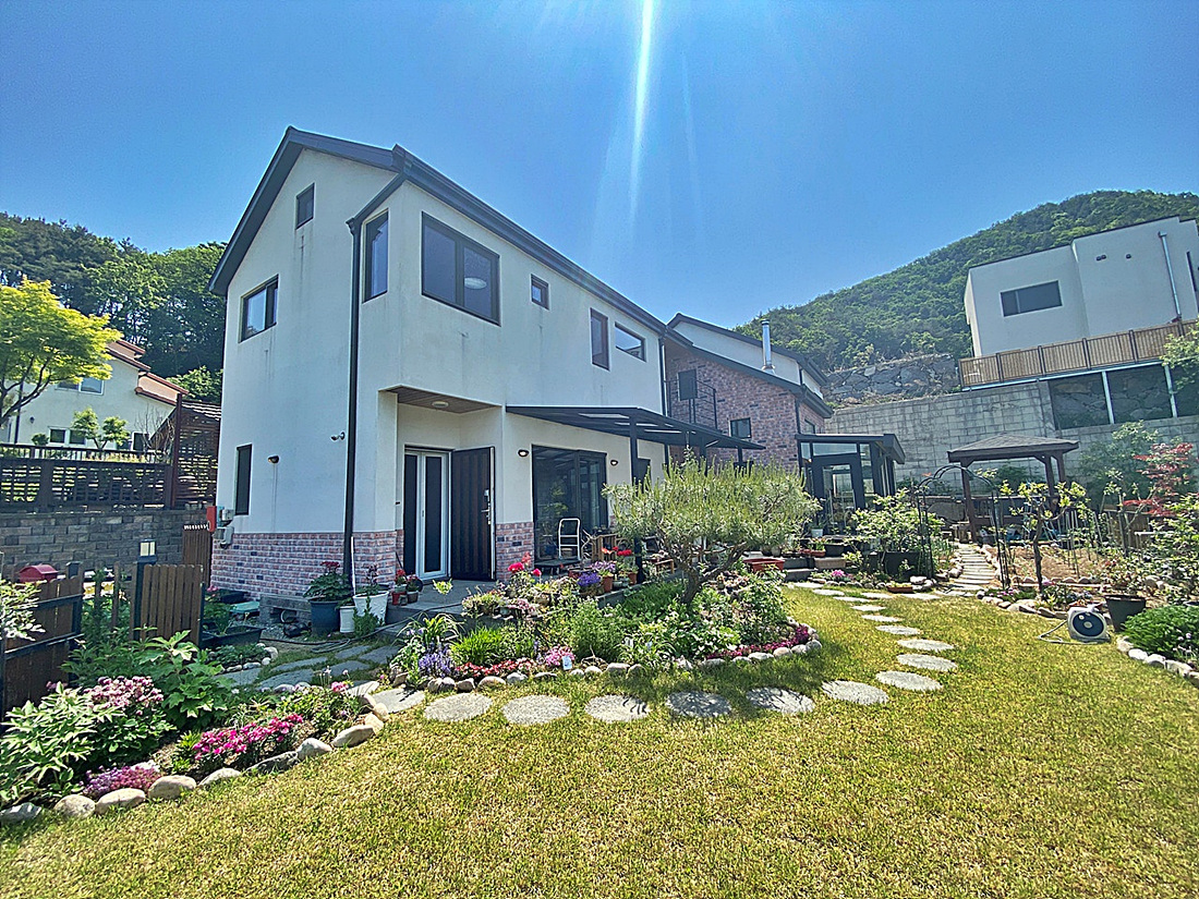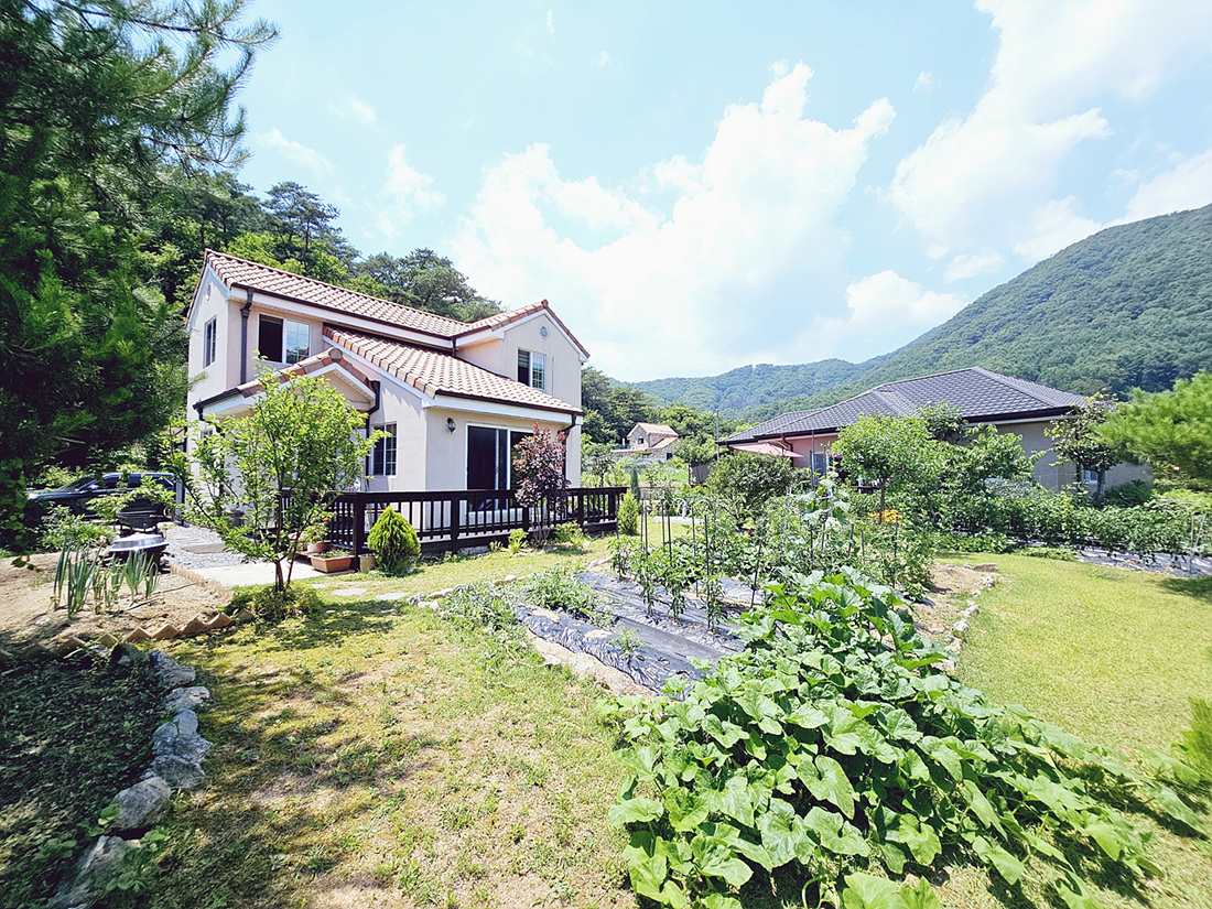 넓은 마당과 관리 잘된 조경수, 산자락 끝에 위치한 사생활 보호되는 전원주택